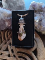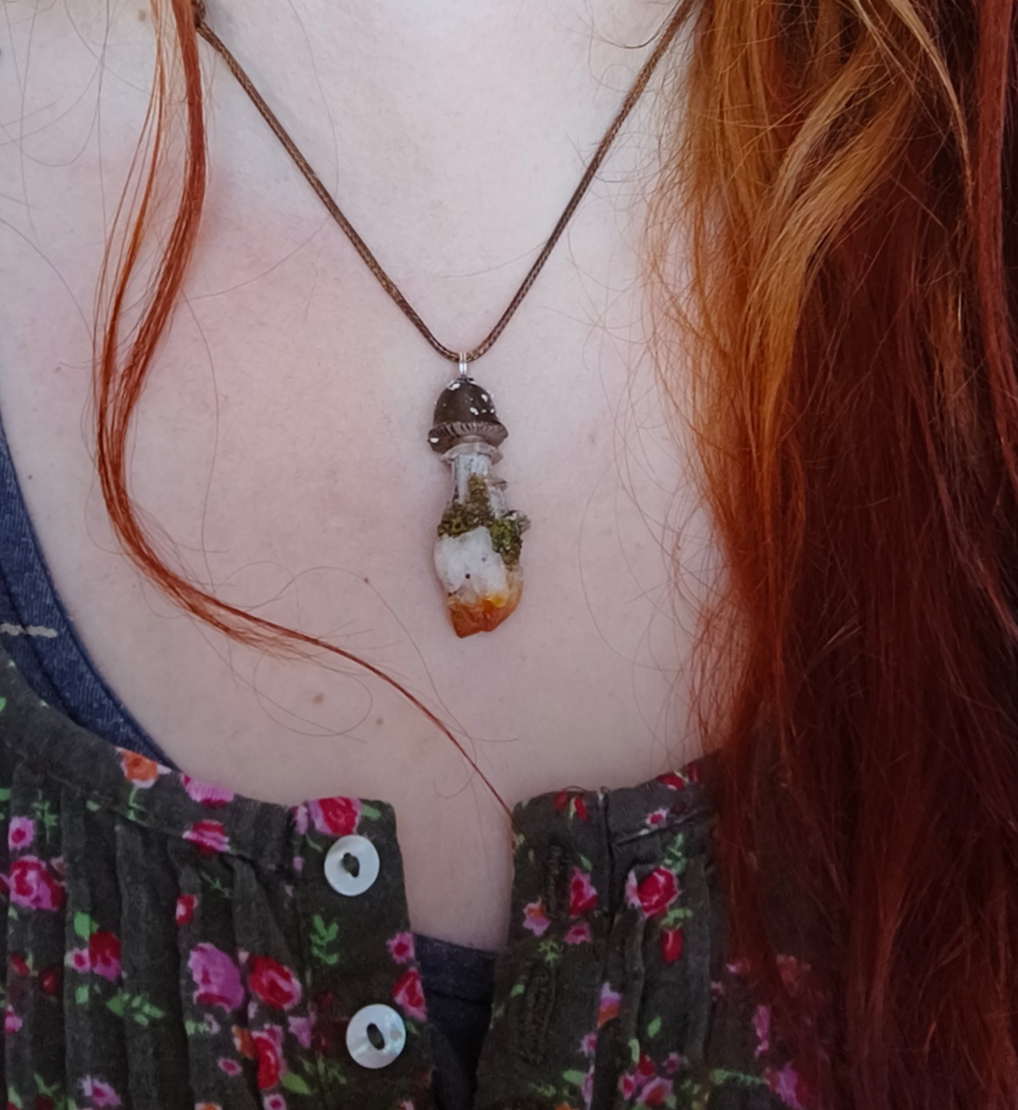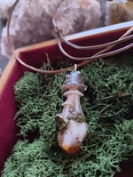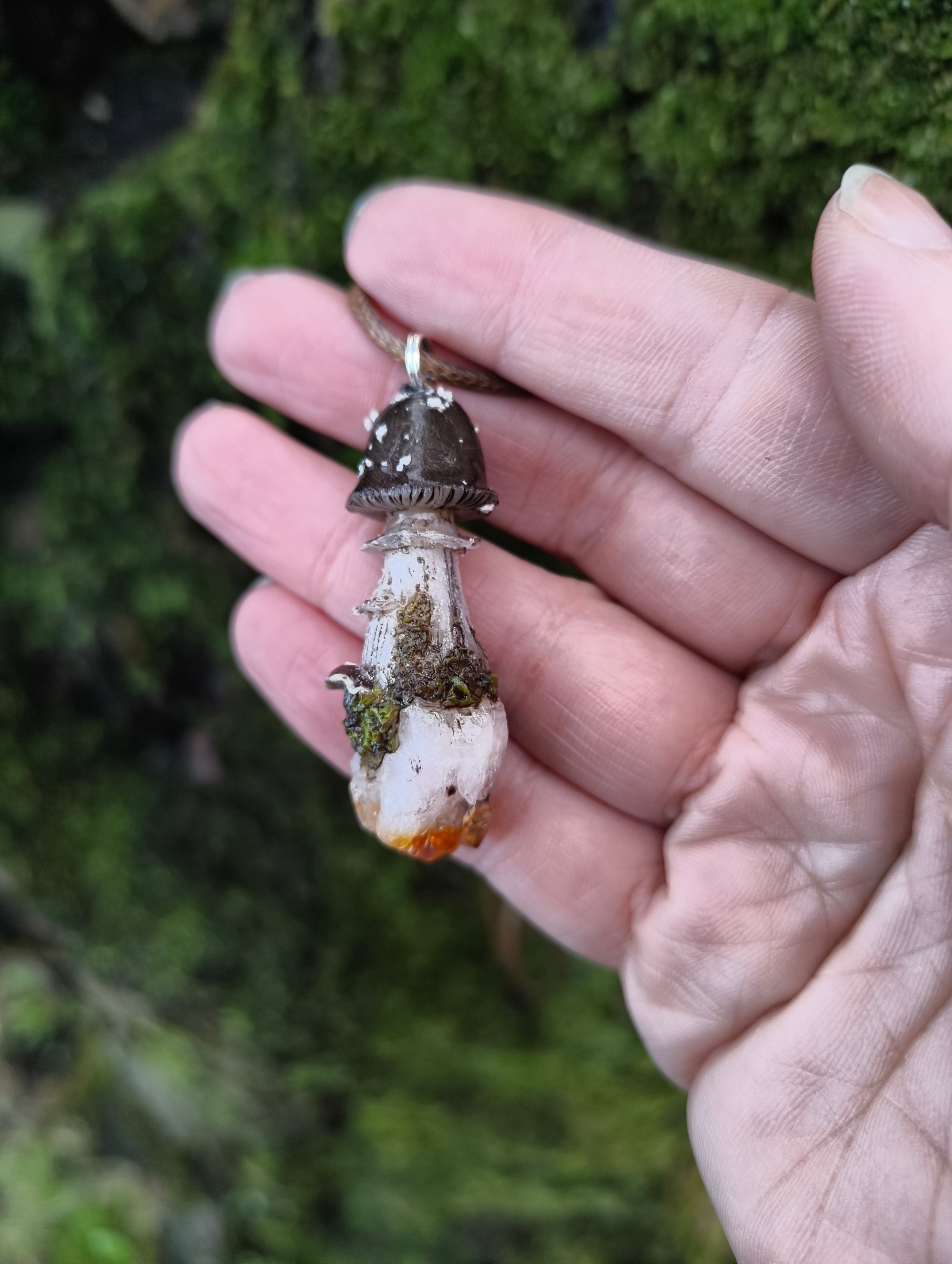 A beautiful little handsculpted polymer clay black capped mushroom pendant on a Brazilian citrine raw point. Tiny oyster mushroom on the stem.