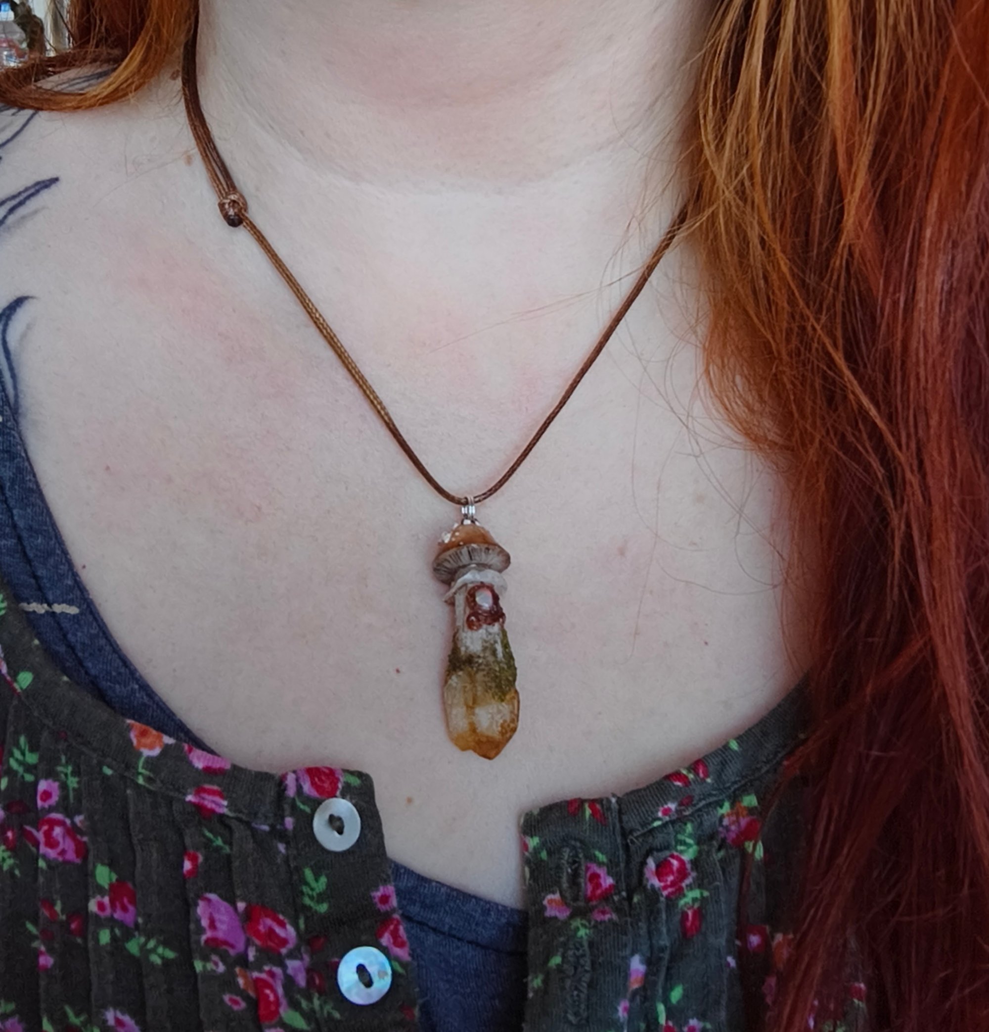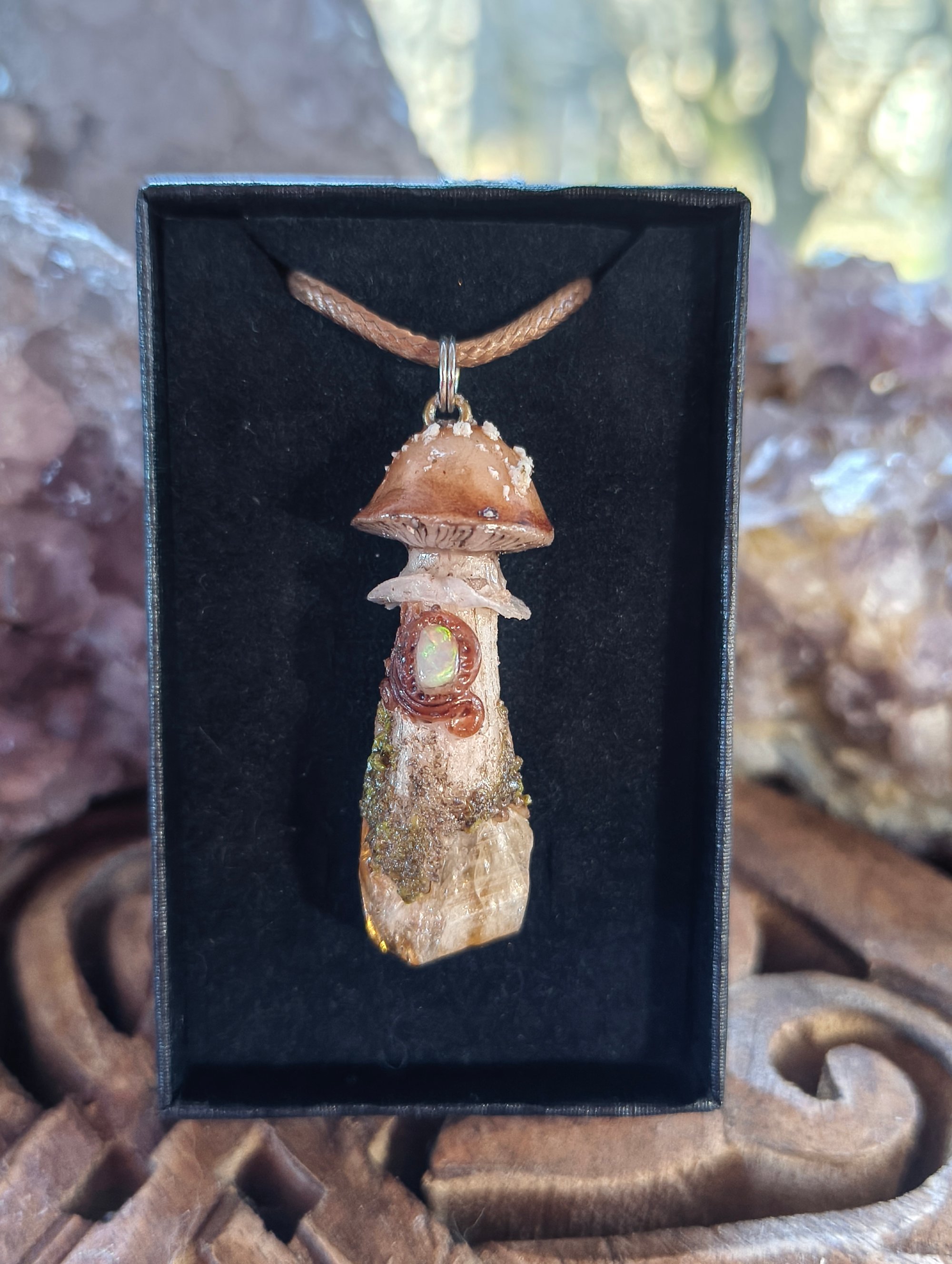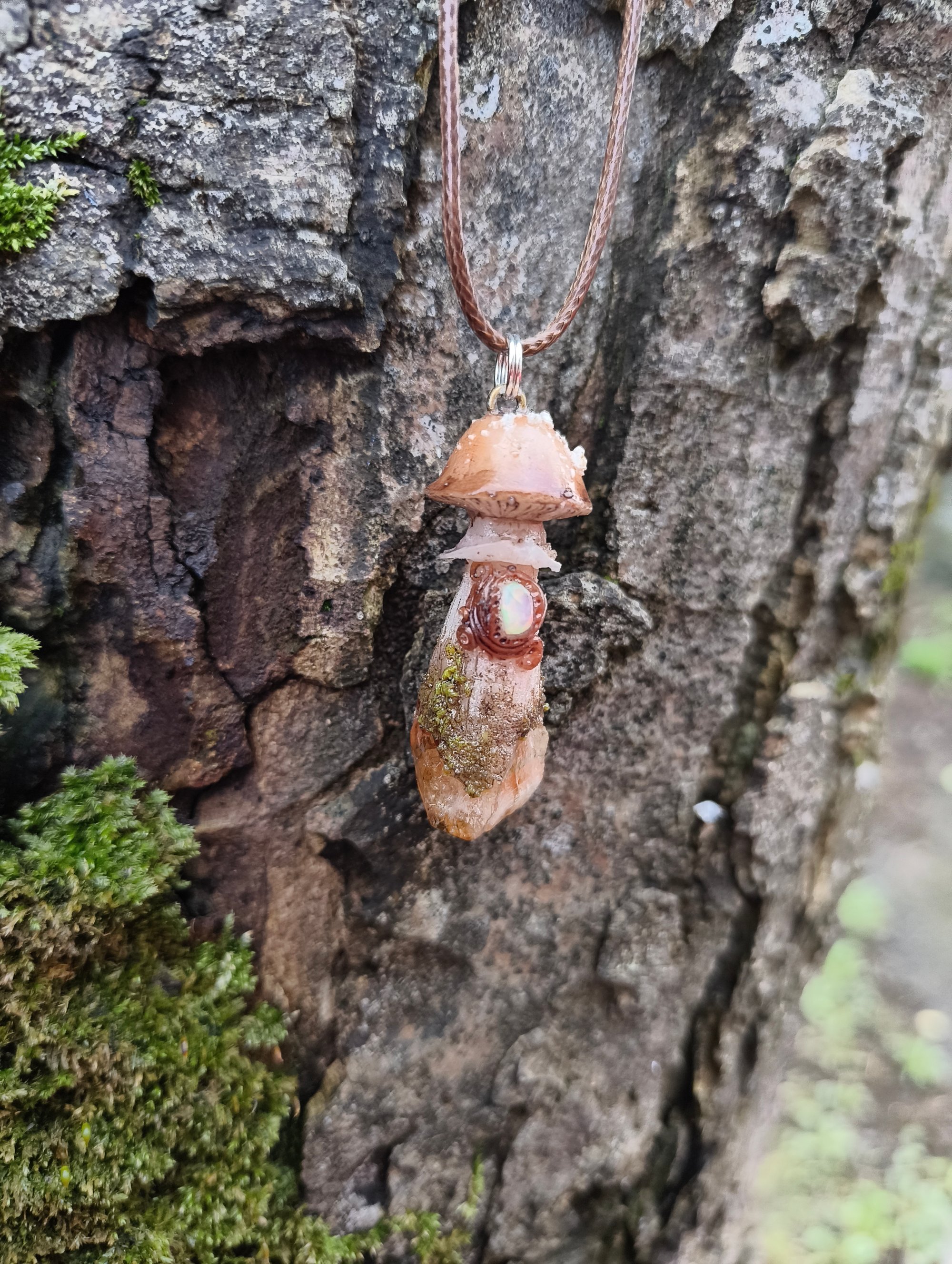 A beautiful little handsculpted polymer clay Field mushroom pendant on a Brazilian citrine raw point. Tiny little opal on the stem.