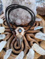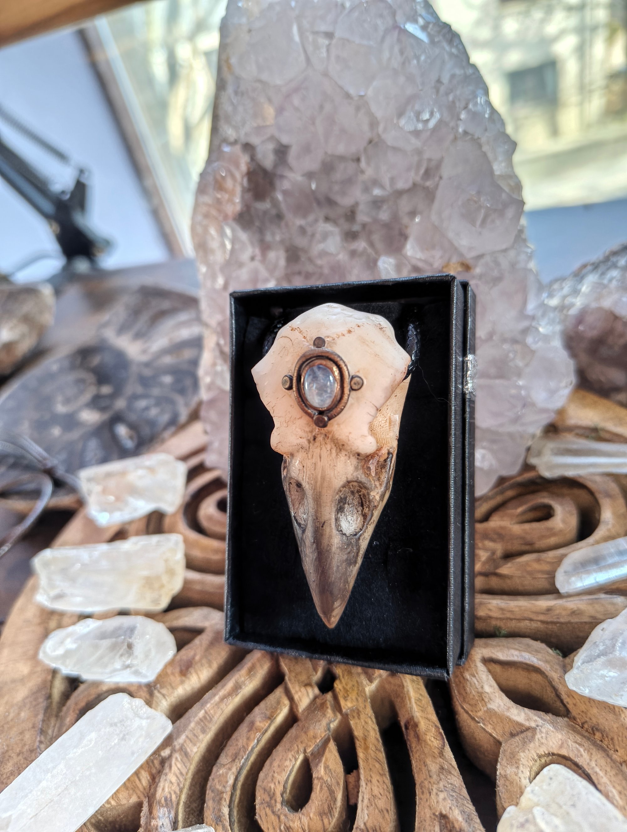 Handmade (not real dead bird!) polymer clay raven skull pendant with a rainbow moonstone set into it in bronze toned detail. Comes on adjustable thick black cord, wrapped in gift box shown.