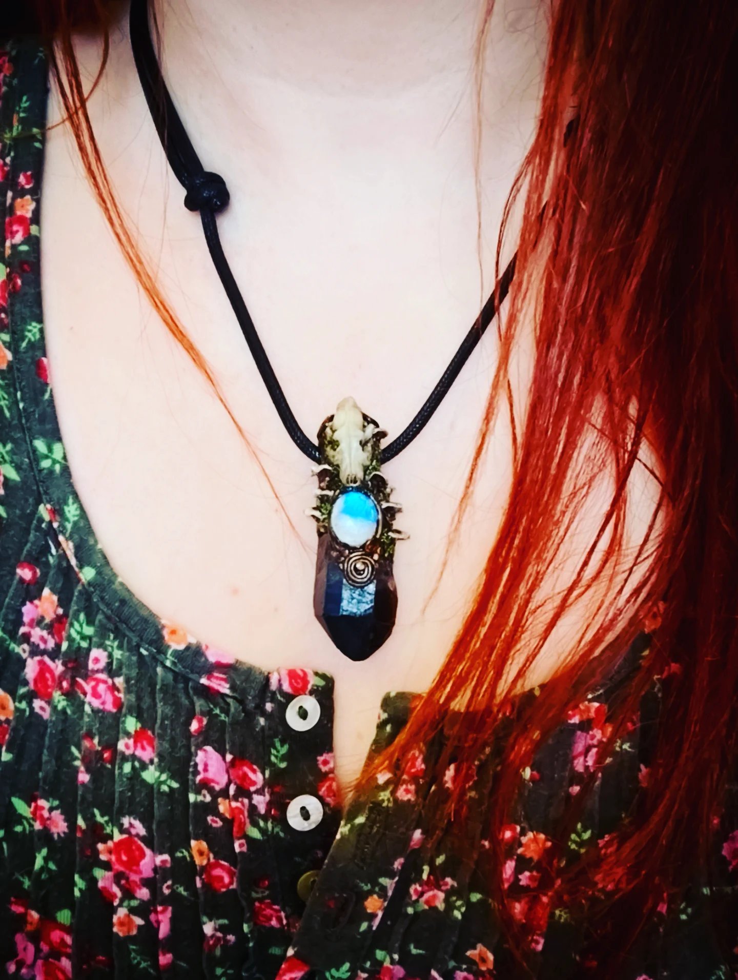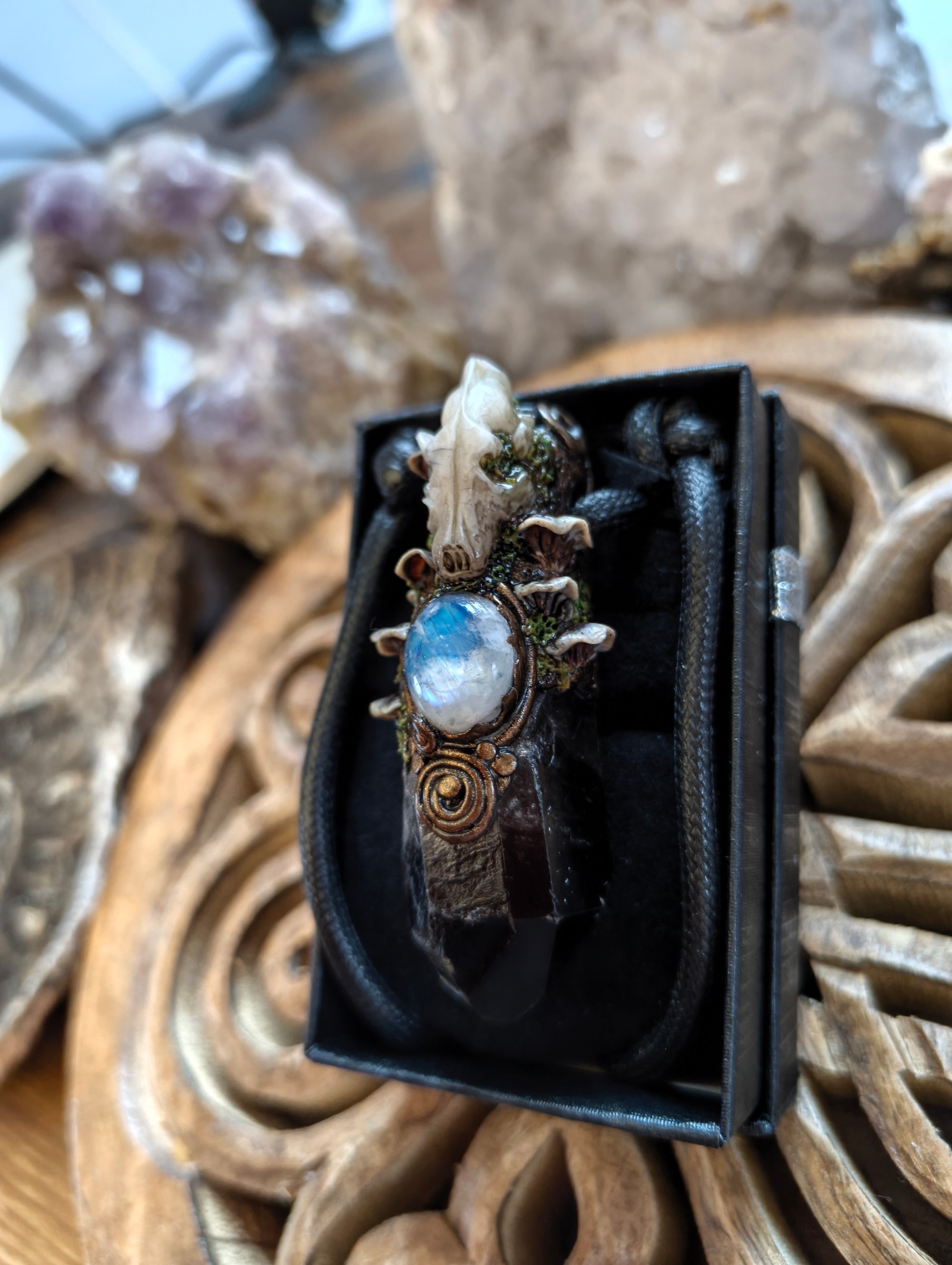 Handmade Moonstone & Smoky Quartz Pendant with Wolf Skull Fantasy Necklace